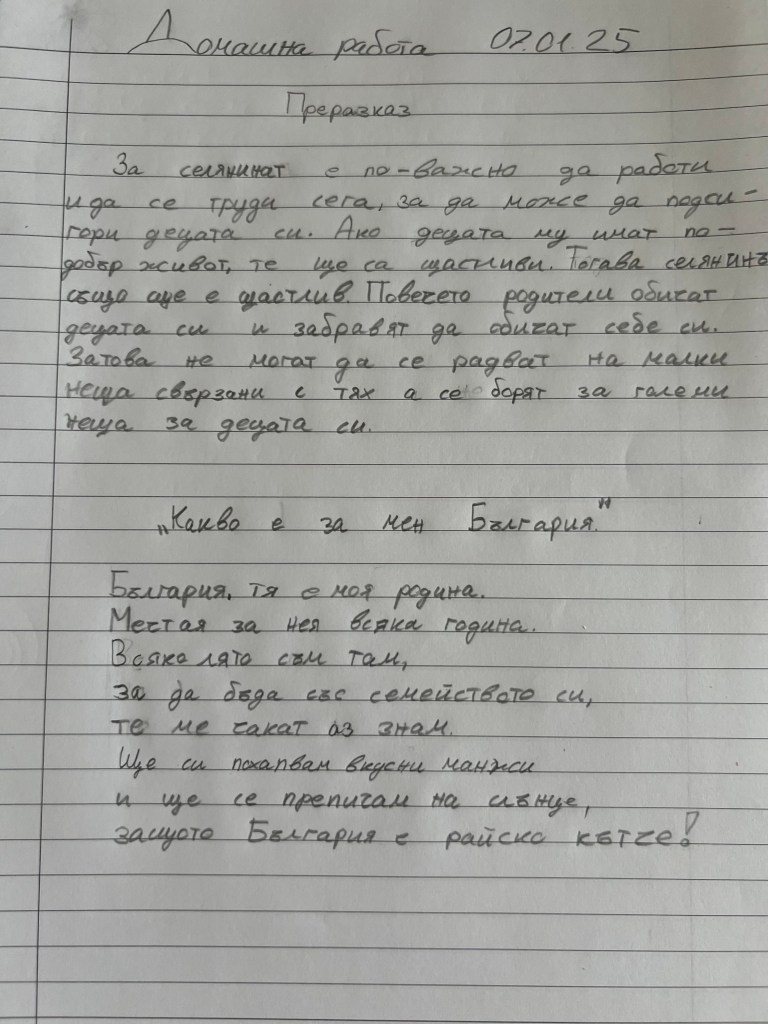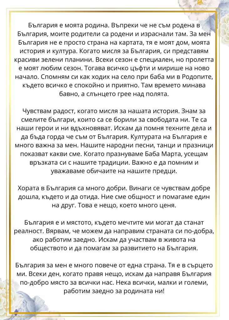 3 март 2025 – какво пишат децата ни Ади 2 клас БългарияDownload Александър 7 клас БългарияDownload Александър Атанасов – България за менDownload Калоян 4 клас България.docxDownload Кристина 11 клас Какво за мен е България_Download Споделяне: Share on X(Отваря се в нов прозорец) X Share on Facebook(Отваря се в нов прозорец) Facebook Харесвам Зареждане...